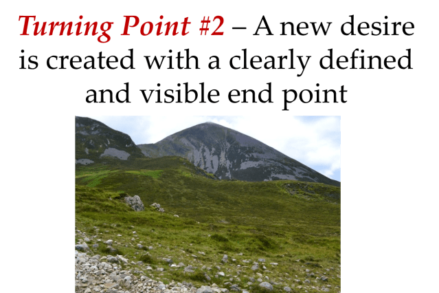Turning Point #2 of The Six Stage Plot Structure marks a hero’s CHANGE OF PLANS.  It is here that a NEW DESIRE is created with a clearly defined end point. Hollywood loves this one, mainly because the hero starts to pursue a new and clearly visible goal.  It is the tangible that gives audiences something to cheer for.  This TP is different than the hero’s initial desire from Turning Point #1