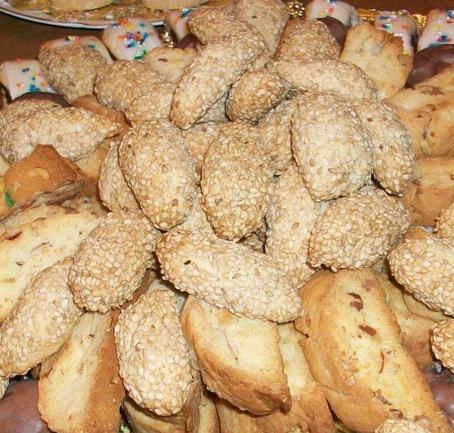 Mix flour, sugar and baking powder. Work in lard until dough is fine. To flour add egg, vanilla and water. Knead until dough is pliable. (Forgive me Grandma but I use the food processor for this) Mix the water/sugar mix with some of the sesame seeds. (Just enough water to dampen the seeds so they will stick to the cookies) Roll pieces of dough into a 1/2 inch rope about 10 inches long then into the sesame seeds. Cut cookies about 1 inch long and then roll each piece between the palms of your hands to make sure the seeds adhere better. (Some in the family don’t do this step but Grandma Mangione was particular about this!)